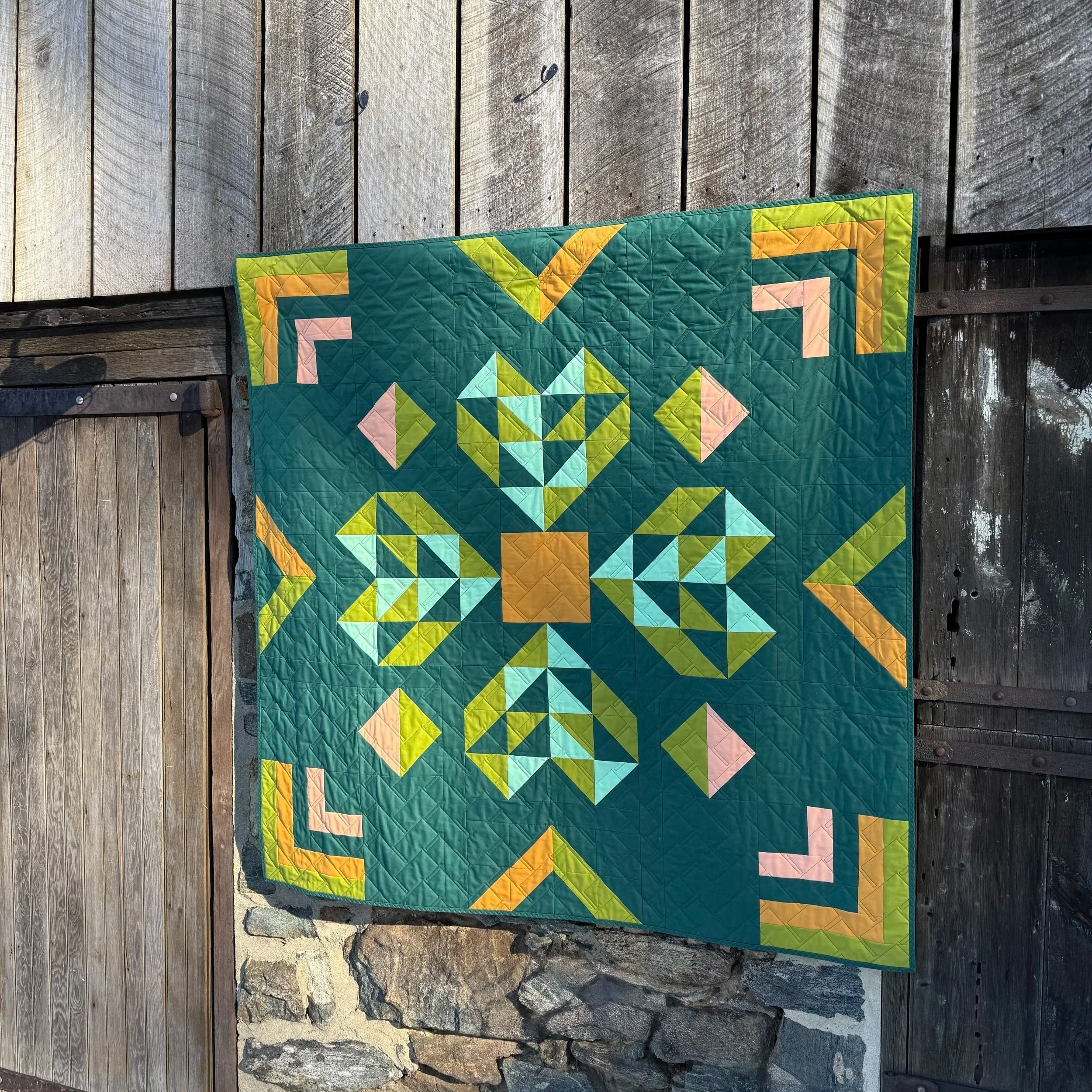 The Cub Stamps quilt is inspired by the colors of spring and sleepy (sometimes grouchy!) bears emerging from a long winter's nap. Our modern spin on the bear paw block includes eight-at-a-time half-square triangles and four patch units. This pattern also includes Seminole piecing to make these beautiful diamond borders.